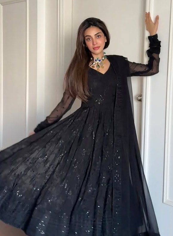 In an episode, Anmol Baloch wore a black formal dress with heavy embroidery. This black outfit was designed by designer Wahajat Mansoor. Anmol Baloch is 27 years old, and she started her career as a fashion model in 2016. Her best dramas are Iqtidar, Sirf Tum, and Qurbetien.